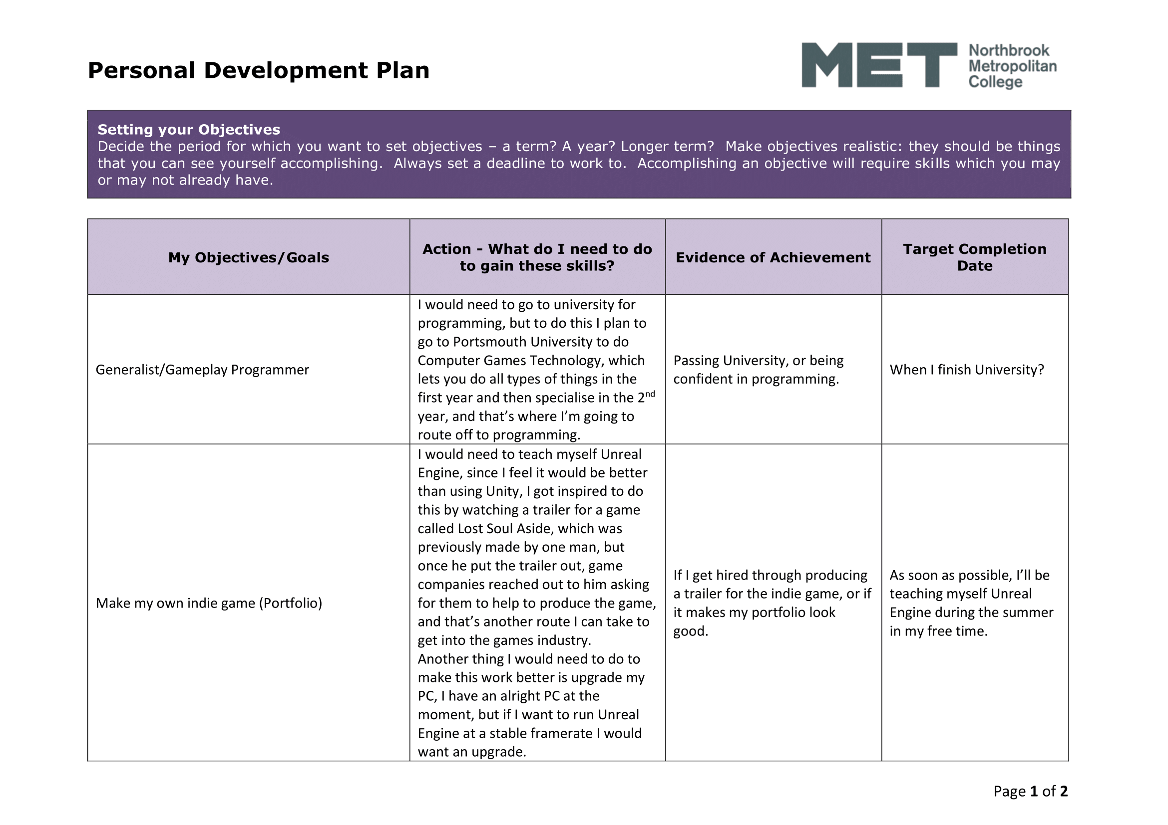 Task 1.1c – Personal Development Plan (PDP)