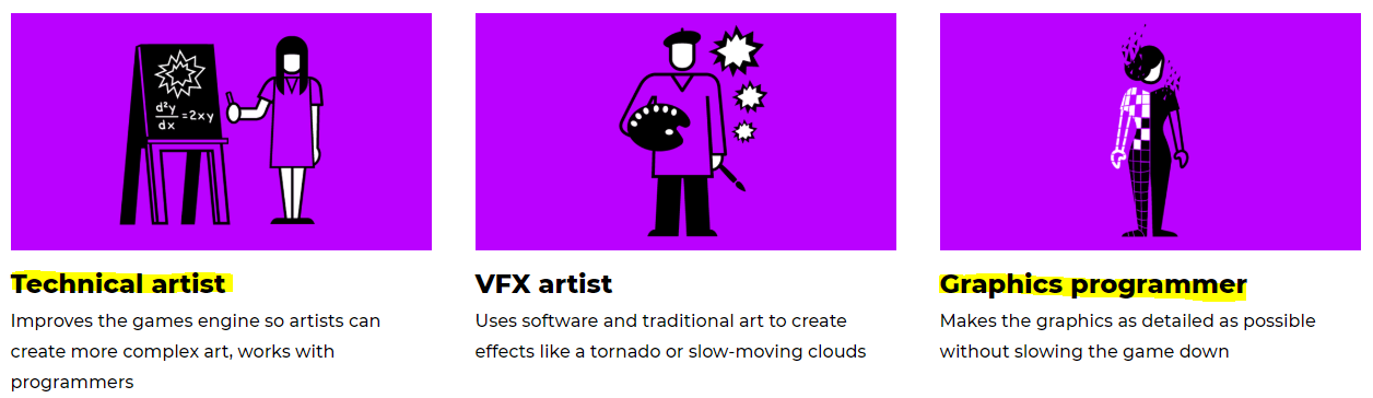 Technical artist – The reason why I like this job is because you’ll always be helping out with both the programmers, artists and 3D modelers – it’s quite an authoritative role, and I feel as if I would be good at it because I have good leadership skills, the thing with being a technical artist though, is you would need to know everything to do with all the paths to ensure you would be the best help, the job can most likely get hard at times. The pros of this job is that it’s a job which is high in demand, lots of places need a technical artist as there isn’t many, so if you manage to learn a lot, you have yourself a stable job, the cons is that it’s a hard job, every job is hard, but this job is to do with fixing problems and doing all the small parts which people don’t understand how to do, so it comes along with teaching other people as well.