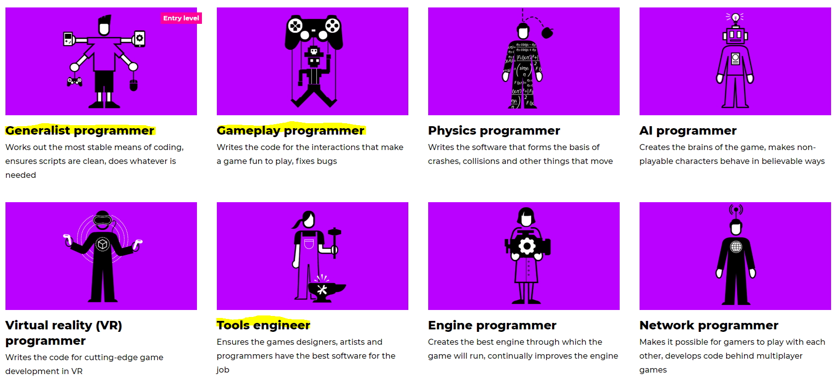 Gameplay programmer – I feel as if this job would be good for me since I love making code for games as I love watching it come together and start working, I would be working alongside a group of people and getting stuff like combat, running and animations to work, and I think that job would be really fun! And it pays well! it’s the same as the Generalist Programmer except you’re making the code and make it fun to play.