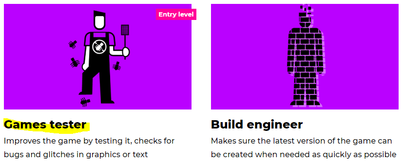 Games tester – I feel like this would be a good job for me to do since I would be testing the game for bugs and glitches, making sure everything works as it should, this means I will be in contact with the people who work on the game which would be an entry point into me getting into the games industry, I’m good at writing critique and long amounts of text so I can always write out and communicate with the people working on the game what is wrong, and how things can be fixed.